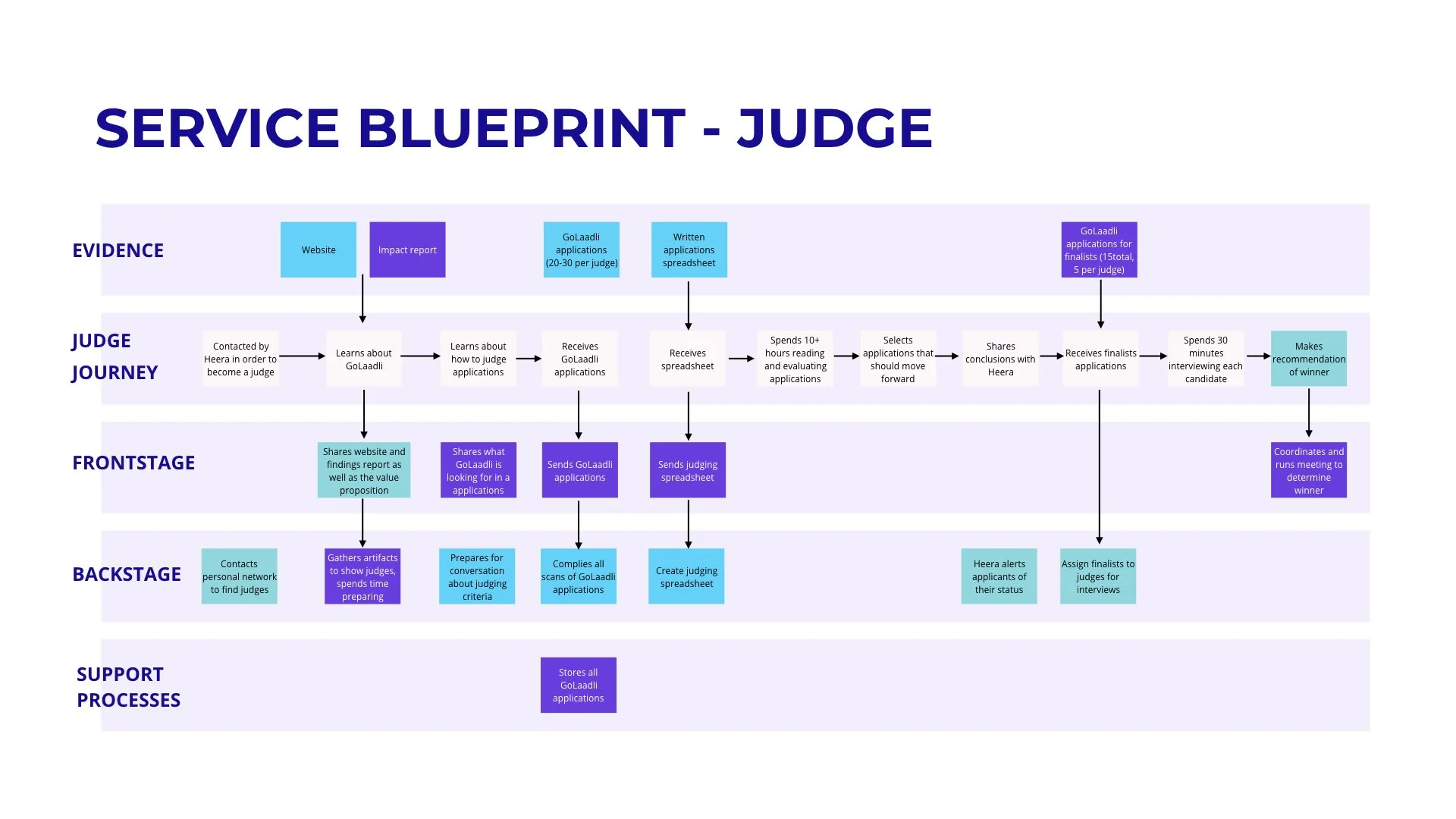 Over the course of 2 months, we conducted extensive primary and secondary research in order to develop our understanding of GoLaadli. It included interviews with 4 target groups (GoLaadli Challenge judges, challenge participants, operating directors, and subject matter experts), organizational research (to familiarize ourselves with the functions and flow of the organization), cultural research (to get an understanding of the cultural thoughts and practices that limit or empower GoLaadli as an organization), social impact research (analysis of similar organizations that exist and how they deal with an international target group and finances), analogous research (scan of a variety of industries/companies/social activities/technological or biological processes with similar limitations)