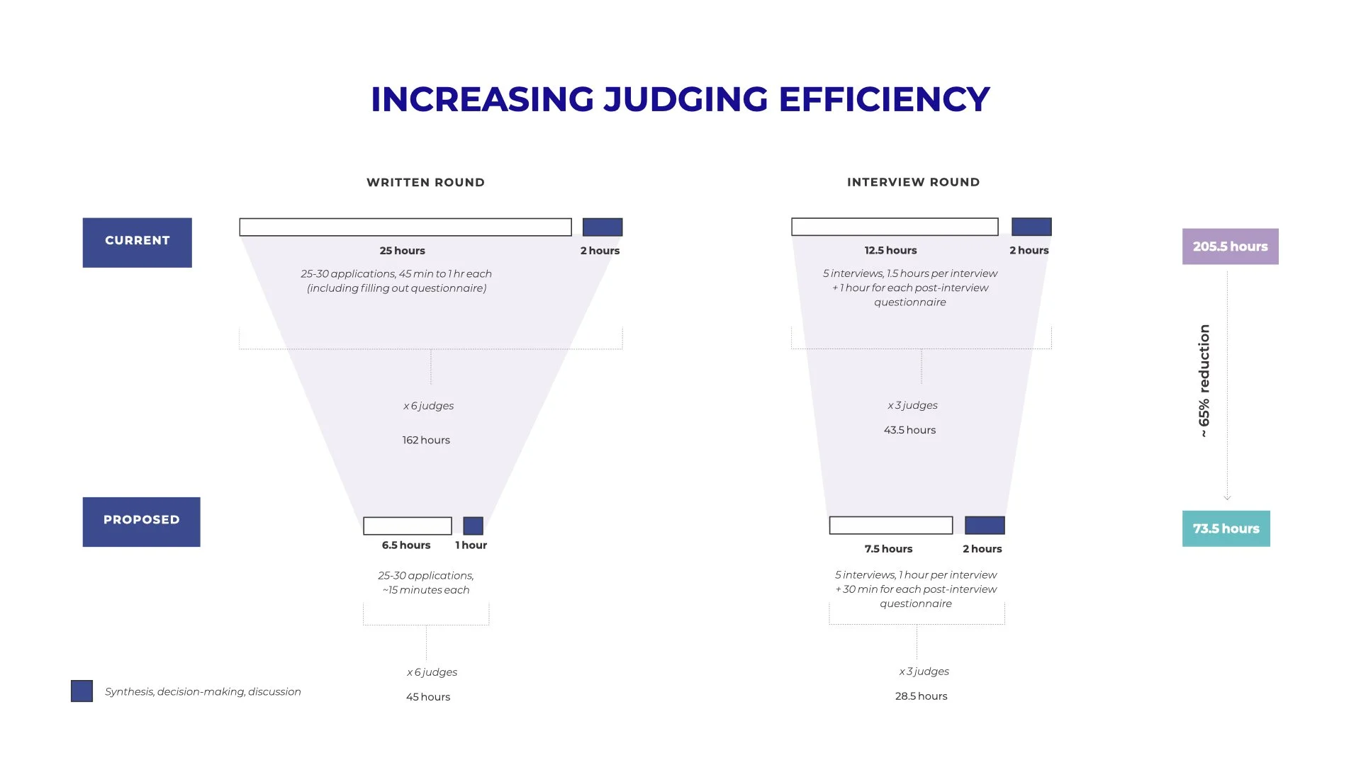 65% reduction in time spent judging, which can pave the way for more judges (who might be more willing to participate with a lower time commitment) and accepting more applications.