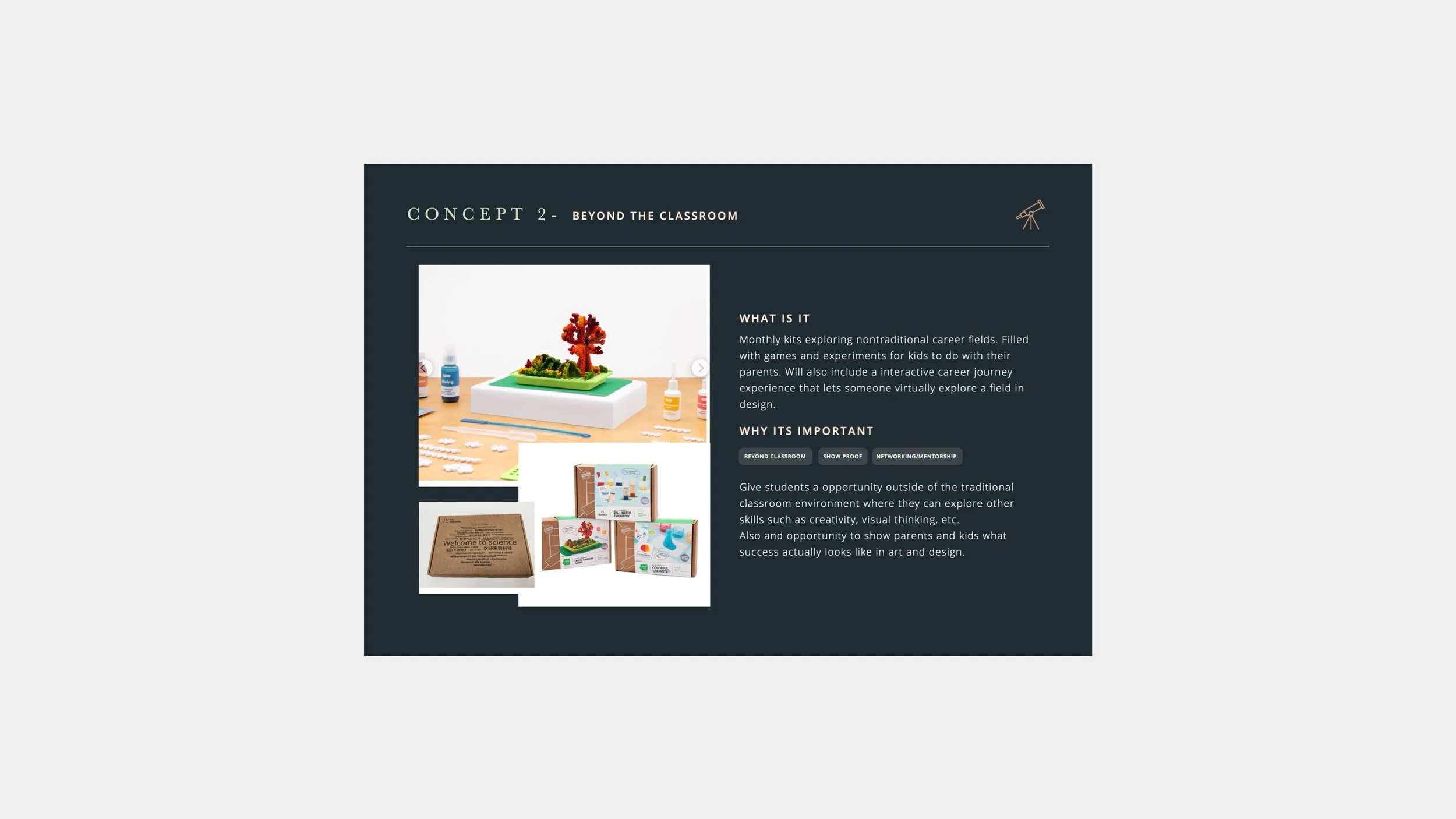 Look Beyond the Classroom - Give students an opportunity outside of the traditional classroom environment where they can explore other skills such as creativity, visual thinking, etc.