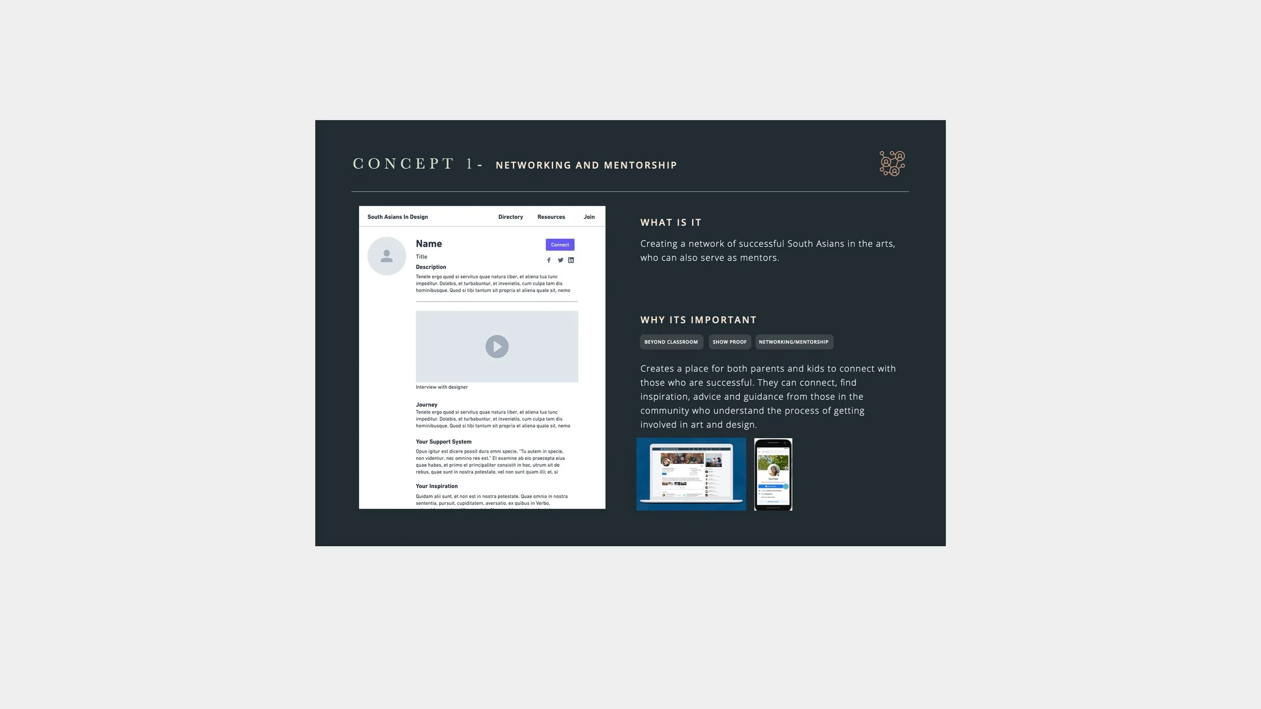 After testing several concepts I landed on one idea that seemed to click with all of my participants. The SAID platform would create a network of South Asian artists and designers that could lean on each other and inspire the future generation. It would first start as a social movement where the artist would share their personal experience and journey (anything from how they communicated with their parents to how they broke into the art and design industry) this would eventually evolve into a platform where artists and designers could connect with each other. Built into this would also be the opportunity to act as a mentor for the younger artist in the community.